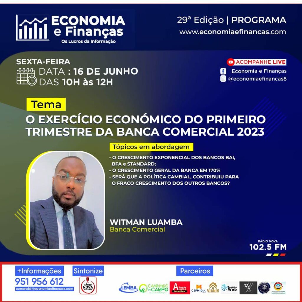 Os lucros da banca comercial angolana cresceram no primeiro trimestre de 2023, 154%, sendo que 76%, foram, para os bancos; BAI, BFA e STANDARD BANK, avançou neste sexta-feira, 16 de junho no programa radiofónico, Economia e Finanças da rádio Nova 102.5 FM, o MBA em Finanças e Negócios, Witman Luamba.